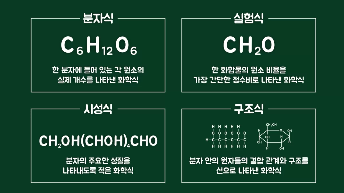 과학 시간에 화학식에 대해서 배운 적이 있을 텐데, 화학식은 어떤 물질이 어떤 원소로 이루어져 있을 때 그 비율이 어떻게 되는지를 기호로 나타낸 겁니다. 그중 분자식(Molecular formula)은 한 분자 안에 들어 있는 원자의 종류와 개수를 명확히 나타낸 것이고, 분자식 외에도 물질의 특성을 표현하는 방식은 다양합니다.