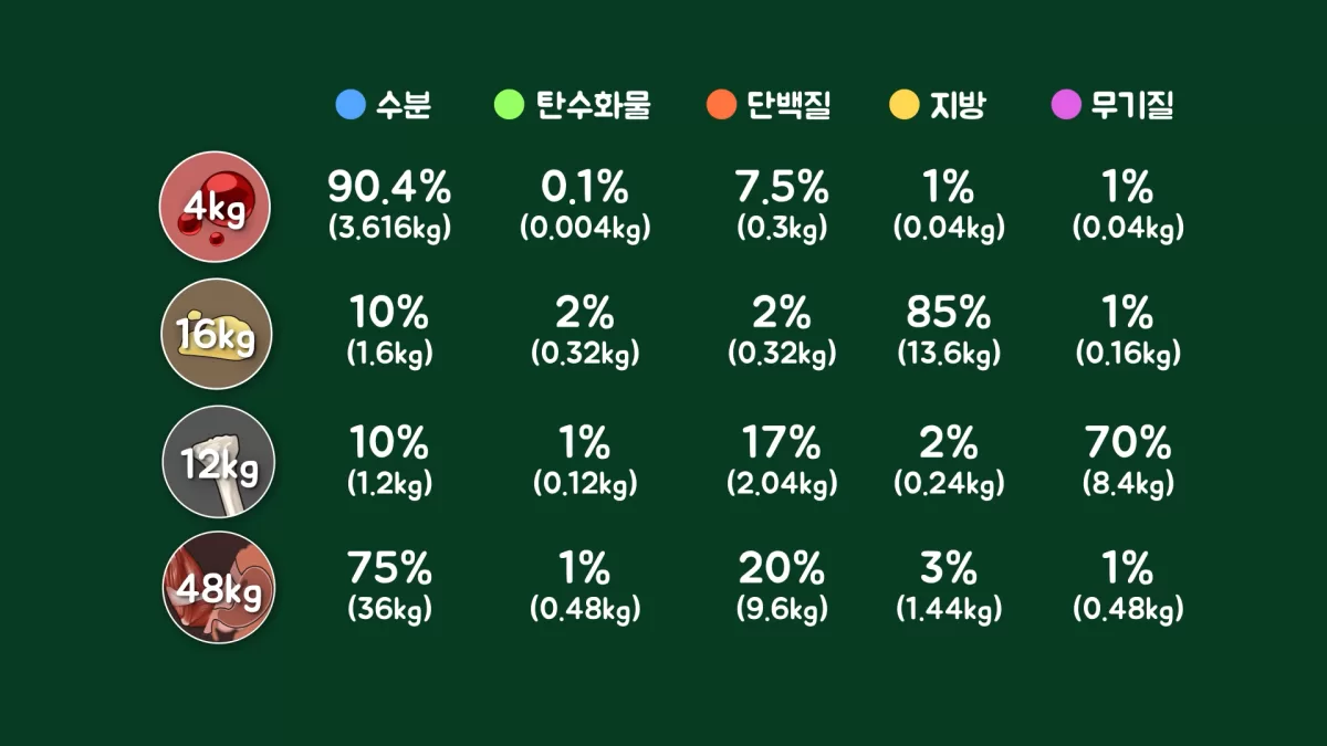 각 조직은 수분, 탄수화물, 단백질, 지방, 무기질 등의 성분이 각기 다른 비율로 조합되어 만들어진 것인데, 이러한 성분들이 각 조직에서 어떤 비율과 질량으로 구성되어 있는지도 따져보면 아래와 같습니다.