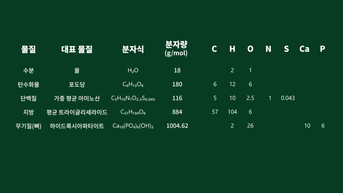 이렇게 계산한 값을 토대로 각 성분의 대표 분자를 선정해 사람의 분자식을 구해보도록 하겠습니다. 대표 분자 선정은 생리학적으로 각각의 분자가 체내에서 가장 많은 형태로 존재하고, 기능적으로 주요한 구조·저장·수송 역할을 실제 담당하는 기준으로 고려했습니다.