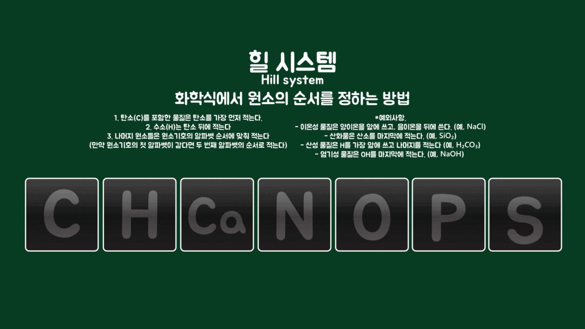 마지막으로 힐 시스템(Hill system)을 이용해서 원자의 구성 비율을 정렬해 분자식을 정리해보면 인간을 구성하는 분자식이 나오는데, 아래(C₁₅₄₇ H₇₆₆₇ Ca₈₄ N₁₀₆ O₂₉₇₃ P₅₀ S₅)와 같습니다.