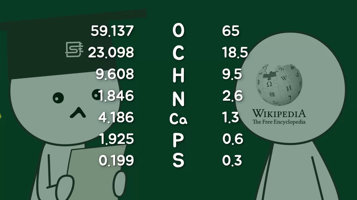 다만, 사람을 구성하는 조직의 주요 성분들을 분자 단위로 나누고, 그 안에 들어있는 원자수를 모두 더해보면 인간을 분자식 형태로 근사한 식을 구할 수는 있습니다. 이번 영상에서는 그 값을 구함으로써 궁금증을 해결해 보려고 합니다.