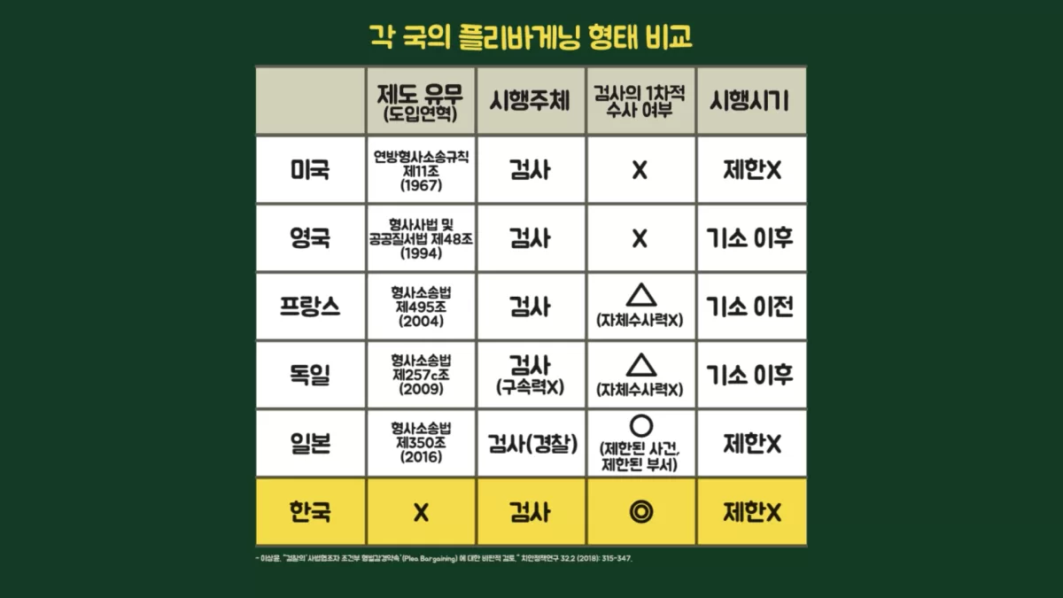 한국도 2011년에 해당 제도를 도입하고자 시도했으나 밀실에서 검사와 범죄자가 형을 정하는 것은 사법 정의와 국민 정서에 반한다는 인식으로 도입되지 못했고, 최근에는 정치권에서 검사의 권한을 줄이는 쪽으로 움직이고 있으므로 제도의 도입 가능성은 작아 보입니다. 궁금증이 해결되셨나요?