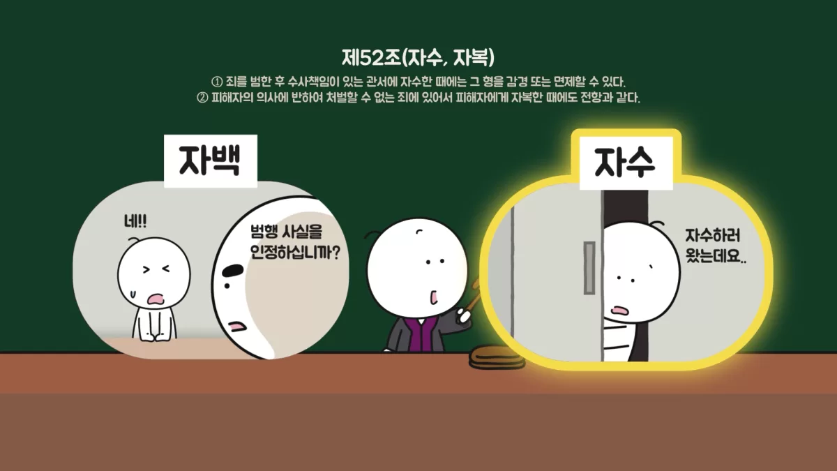 그리고 더 나아가 수사가 이미 시작된 상태에서 수사관의 물음에 잘못을 인정하는 자백이 아니라 스스로 찾아가 범죄를 알리는 자수를 하면 형법 제52조에 따라 조금 더 강력하게 형을 낮추는 요소(특별감경인자)로 적용되어 자백할 때보다 형을 더 많이 낮춰줄 가능성이 높습니다.