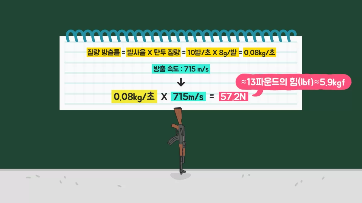 계산해 보면 AK-47이 1초에 8g짜리 총알 10개를 초당 715m의 속도로 발사하는 경우 추진력은 57.2N(≈13파운드의 힘(lbf)≈5.9kgf)으로 약 6kg 무게만큼의 힘이 위쪽으로 작용합니다. AK-47이 장전된 상태에서 무게가 약 4.76kg 정도이므로 땅에서 뜰 수 있고, 위쪽으로 가속도 받습니다.