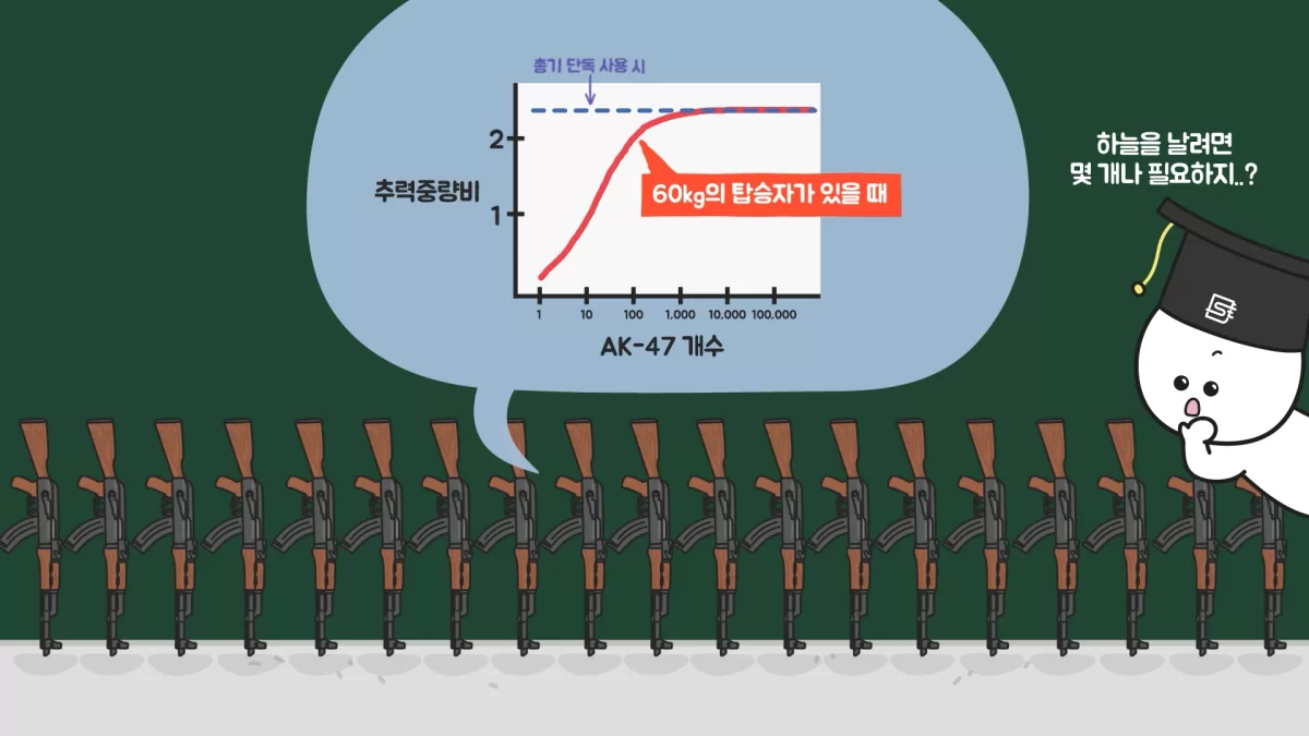그래서 최적의 장치는 250발을 장전한 AK-47을 300자루 이상 준비해서 한 번에 발사하는 겁니다. 그러면 수직으로 초당 100m에 가까운 속도를 얻을 수 있고, 60kg 사람일 때 공중으로 약 500m까지는 올라갈 수 있게 됩니다.