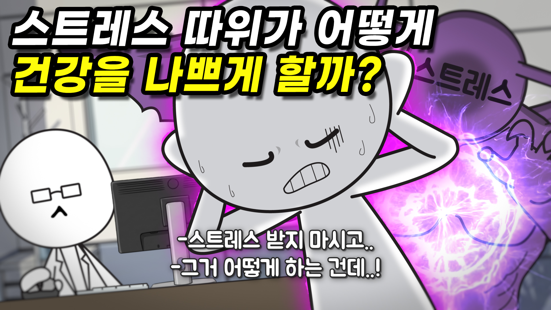 사전적 정의는 인간이 심리적 혹은 신체적으로 감당하기 어려운 상황에 부닥쳤을 때 생기는 불안과 위협의 감정입니다. 여기서 주제의 궁금증이 생기는데, 이런 감정적인 요인이 어떻게 건강을 해친다는 걸까요?