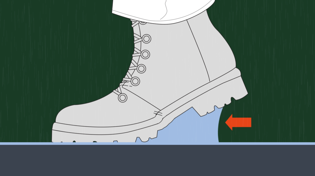 내용을 보면 보행 중 스탠스 구간에서 젖은 땅에 발을 디딘 후 발뒤꿈치를 땔 때 물 표면에 있는 물 분자들이 서로 뭉쳐 있으려는 표면장력에 의해 신발 밑창과 바닥 사이에 쐐기 모양의 물기둥을 형성합니다.