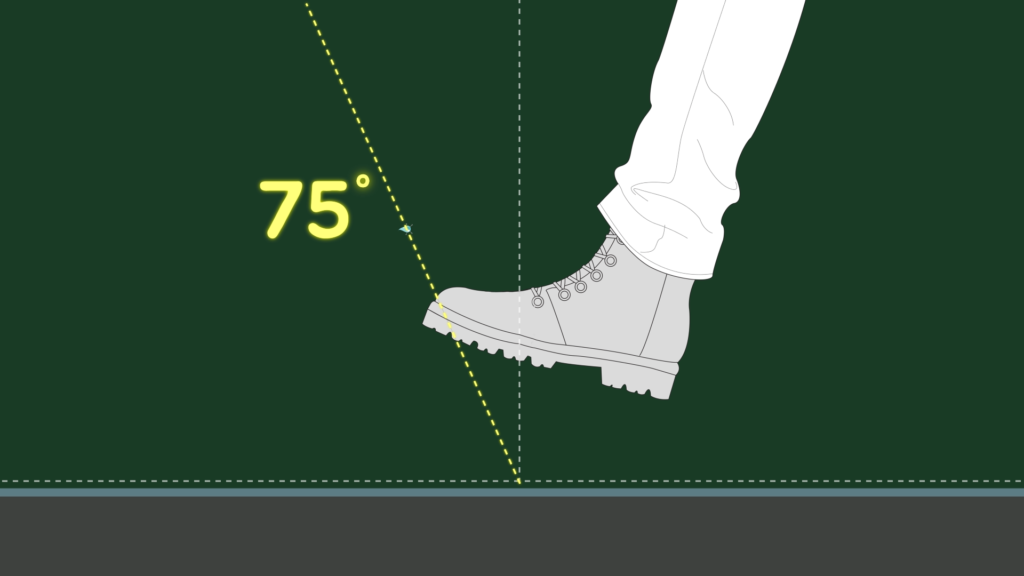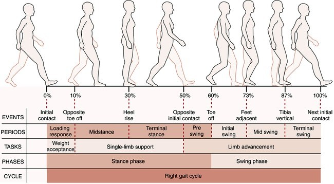 스탠스 구간에서 왼쪽 다리가 스윙하면서 몸이 앞으로 나가는데, 이에 맞게 오른쪽 발의 뒤꿈치부터 발바닥, 발가락 순으로 땅을 딛습니다. 이후 발가락 부위로 지면을 밀면서 앞으로 나감과 동시에 발바닥이 지면으로부터 완전히 떨어지고, 스윙 구간에서는 왼쪽 발로 선 채로 앞으로 나가면서 몸통 뒤에 있는 발을 앞으로 회전합니다.