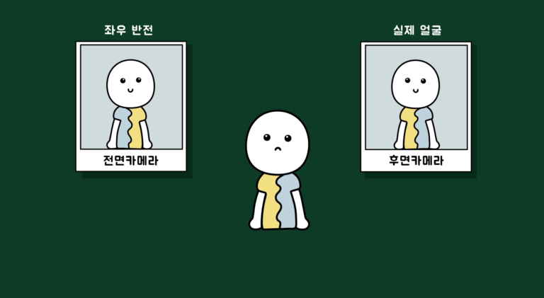그런데 전면카메라는 거울 속에서 보던 좌우 반전된 익숙한 나의 얼굴이고, 후면카메라는 좌우 반전되지 않은 실제 다른 사람이 보는 나의 얼굴입니다. 그래서 후면카메라로 찍은 얼굴 사진을 보면서 다른 사람 눈에는 자신의 얼굴이 정말 이렇게 보일까 싶어서 고민하는 겁니다.