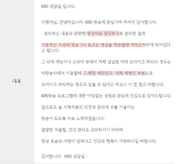 일단 기본적인 지상파 방송 3사에서는 관련제공 영상을 제공할 때 로고는 고지하게 되어 있다고 합니다. 그 외에 예능이나 드라마 등에서 자체적으로 삽입한 자막은 해당 방송을 이용하는 타 방송사의 해당 제작진의 자체 재량으로 이루어진다고 합니다. 그러니까 자막을 보여줘도 되고, 모자이크해도 된다는 이야기입니다.