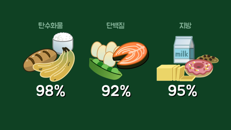 단백질은 요소·요산·크레아틴 등 에너지를 함유한 화합물이 되어 소변으로 배설되는 등 불완전연소를 하므로 이에 해당하는 열량 1.3kcal를 단백질 5.65kcal에서 빼줘야 합니다. 그리고 사람이 식품을 섭취할 때 영양소를 전부 흡수할 수는 없으므로 소화흡수율도 고려해야 합니다.