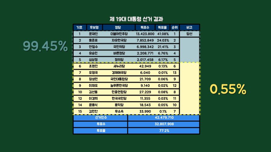 5명의 후보가 전체 표 중에서 99.45%의 표를 나눠가졌고, 사퇴한 2명의 후보를 제외한 나머지 8명의 후보가 0.55%의 표를 나눠가졌습니다. 사실상 5명의 후보를 제외하고는 득표율이 0%에 수렴하는데, 여기서 주제의 의문이 생깁니다. 지지율이 낮은 후보들은 어떤 목적으로 대선에 출마한 걸까요?