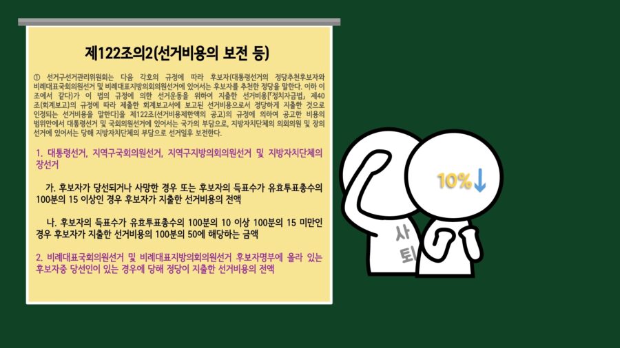 그리고 본격적으로 선거 운동에 들어가면 기탁금 외에도 많은 비용이 들어갑니다. 선거비용은 후보자가 총 유효 투표수의 15% 이상을 얻으면 선거비용 전액을 돌려받고, 10~15%를 얻으면 절반을 돌려 받을 수 있으나 득표율이 10%에 못 미치거나 사퇴하면 보전해주지 않으므로 기탁금을 포함해 지출한 선거비용을 전부 부담해야 하는 상황이 생길 수도 있습니다.