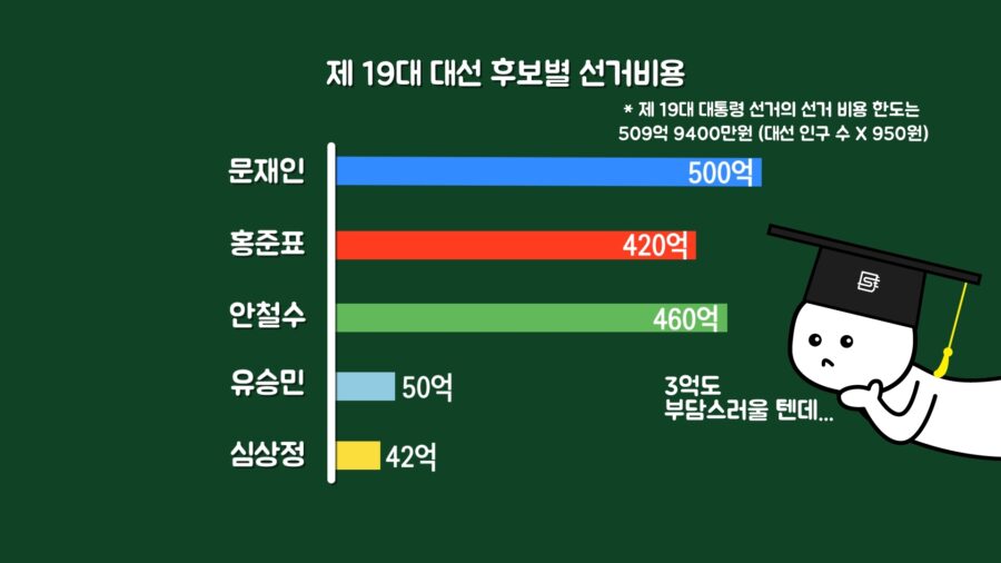 제19대 대선 후보별 선거비용 규모를 살펴보면 위와 같은데, 군소정당의 후보들은 훨씬 적은 비용을 썼겠으나 그래도 부담스러운 비용일 겁니다. 후보자가 금전적으로 여유가 있고, 후원금이 잘 모인다면 도전해볼 수도 있겠으나 낮은 확률에 3억 원 이상의 비용을 지출하는 것은 쉽지 않은 선택이기에 의문이 드는 겁니다.