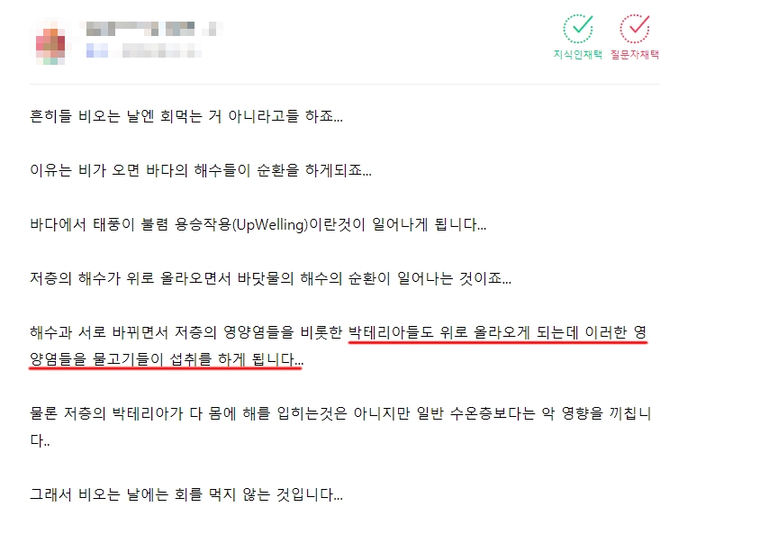 그렇기에 비가 오는 날을 특정해서 위험하다고 말하는 것은 무리가 있습니다. 이 부분은 횟집 사장님들이 청결하게 관리하고 있을 것으로 믿습니다. 궁금증이 해결되셨나요?