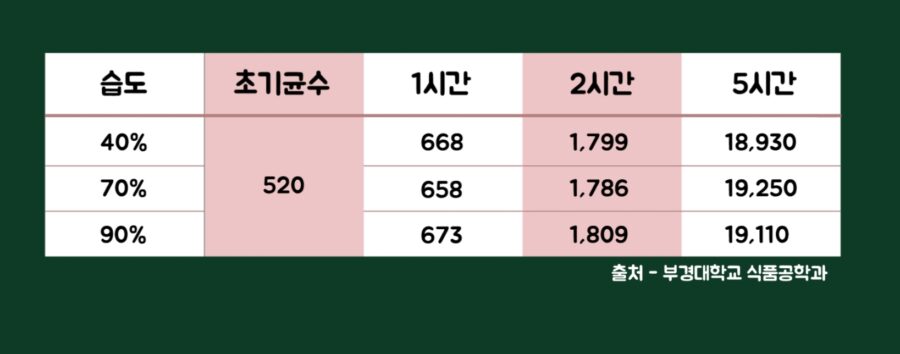 이와 관련해서는 항상 언급되는 실험자료가 있습니다. 부경대학교 식품공학과에서 진행한 실험으로 넙치살에 비브리오균을 동일하게 주입해 감염시키고, 보관온도를 30℃로 통일한 다음에 40%, 70%, 90% 습도의 환경에서 각각 배양하는 실험입니다. 결과를 보면 균 배양률에서 별다른 차이를 보이지 않았습니다. 즉, 사실이 아닙니다.