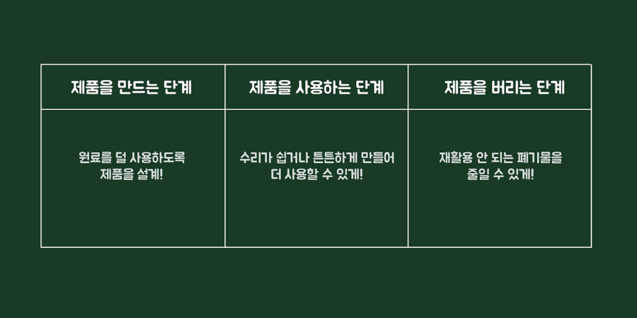 바로 이 법에 근거한 제도인 ‘순환이용성 평가제도(제품등의 유행성 및 순환이용성 평가제도)’ 덕분인데, 순환이용이란 제품을 만들어서 사용하고 버리는 단계에서 위 표와 같은 목적을 달성하는 것입니다.
