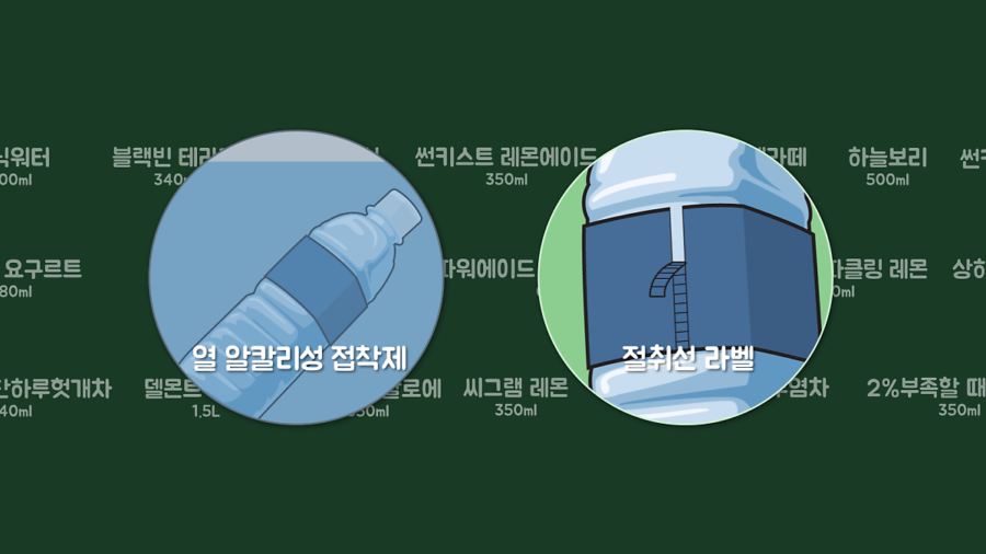 다음으로 라벨 같은 경우는 소비자가 크게 변화를 느끼지 못했을 텐데, 잘 떨어지는 열 알칼리성 접착제를 적용하거나 절취선을 넣어서 라벨이 쉽게 벗겨지는 비접착식 라벨로 개선했습니다.