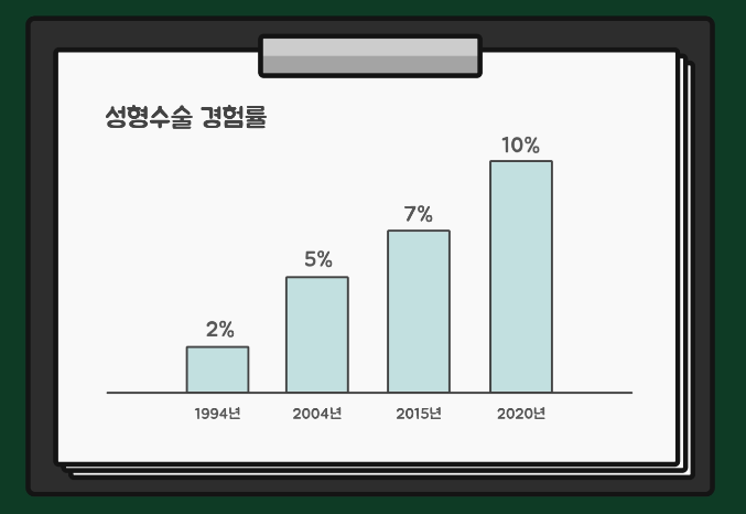 한국갤럽조사연구소에서 조사한 결과에 따르면 2020년 기준으로 우리나라 성인 여성 18%, 남성 2%가 성형수술을 한 적이 있다고 합니다(*사례수 1,500명 (여성 757명, 남성 743명)). 그리고 나이가 어릴수록 성형수술 경험률이 크게 높았고, 시간이 흐를수록 경험률이 가파르게 증가했습니다.