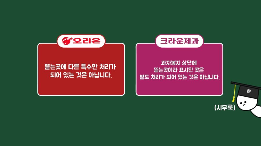 혹시 특수처리가 되어 있어서 따로 표기해놓은 것일까 싶어서 과자 제조 업체에 문의해봤고, 오리온과 크라운제과에서 답변받은 내용에 따르면 아무런 특수처리가 되어 있지 않다고 합니다. 즉, 과자 봉지 윗면의 아무 위치에서나 봉지를 뜯을 수 있다는 것이고, 실제 해보면 그렇다는 사실을 알 수 있습니다.