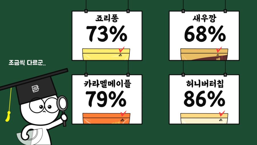 계산해보면 죠리퐁은 윗면 왼쪽을 기준으로 73% 위치에 있었고, 새우깡은 68%, 카라멜메이플은 79%, 허니버터칩은 86% 위치에 있었습니다.