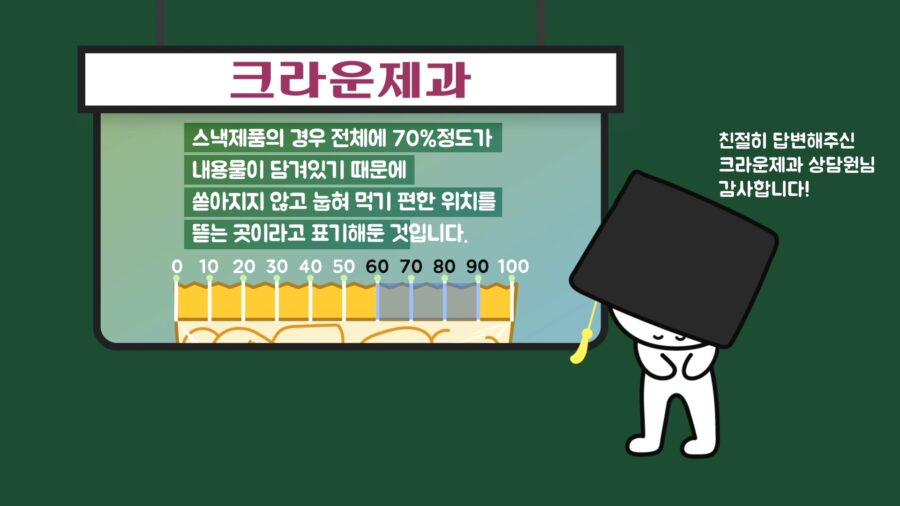 그러면 아예 중앙쯤에 ‘▲뜯는곳’ 표기를 해놨으면 더 좋지 않았을까요? 이와 관련해 크라운제과로부터 답변 받은 내용에 따르면 60~90%의 위치에서 뜯었을 때 과자 내용물이 개봉된 부위로 쏟아지지 않는 위치라고 합니다.