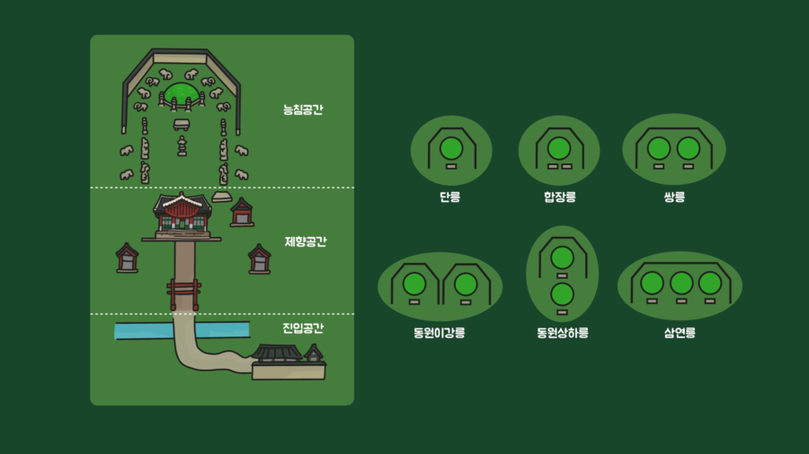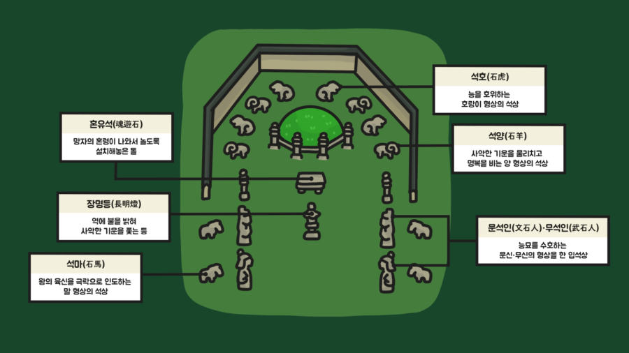 그리고 능 주변을 둘러보면 혼유석, 장명등과 같은 석조물과 석마, 석양, 석호를 형상화한 석물, 문석인과 무석인을 형상화한 석인 등이 보일 텐데, 모두 능을 보호하기 위해 설치된 것으로 시대에 따라 다양한 특색을 나타냅니다.
