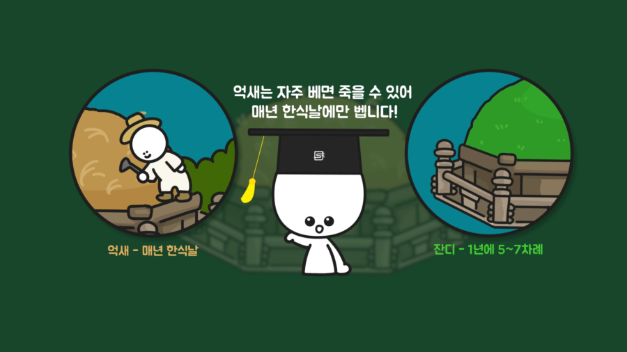 무덤의 모습을 떠올려보면 아마 잔디가 입혀진 모습이 떠오를 겁니다. 그런데 왜 무덤에 잔디를 입혀놨을까요? 잔디는 볏과에 속하는 여러해살이풀 중 밭을 조성할 수 있는 종을 통틀어 말합니다. 보통은 공원이나 경기장에서 볼 수 있는데, 이런 잔디를 무덤에 입힌 이유는 잔디의 장점 때문입니다.