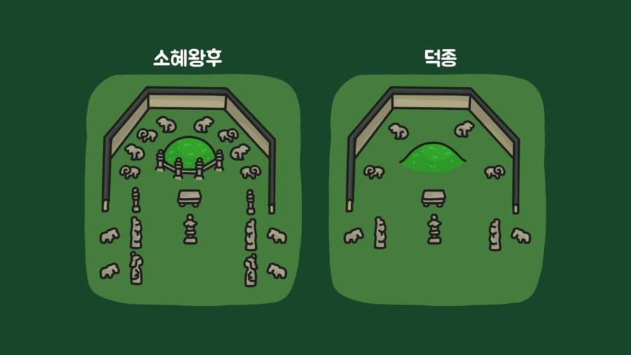 이에 대한 근거로 두 개의 능을 멀리서 살펴보면 왼쪽 언덕에는 소혜왕후의 능이 있고, 오른쪽 언덕에는 덕종의 능이 있습니다. 일반적으로 왕릉이 왼쪽, 왕비릉은 오른쪽에 있는 것이 상례임에도 죽었을 때의 신분차이 때문에 달리한 것으로 볼 수 있습니다.