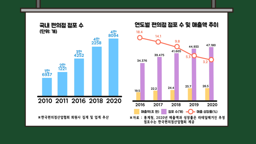 국내 편의점 점포 수나 매출액 규모를 보면 조금 더 와닿는데, 개략적으로 위와 같이 추정되고, 2021년을 기준으로 전국 점포 수가 무려 5만 개를 돌파했다고 합니다.