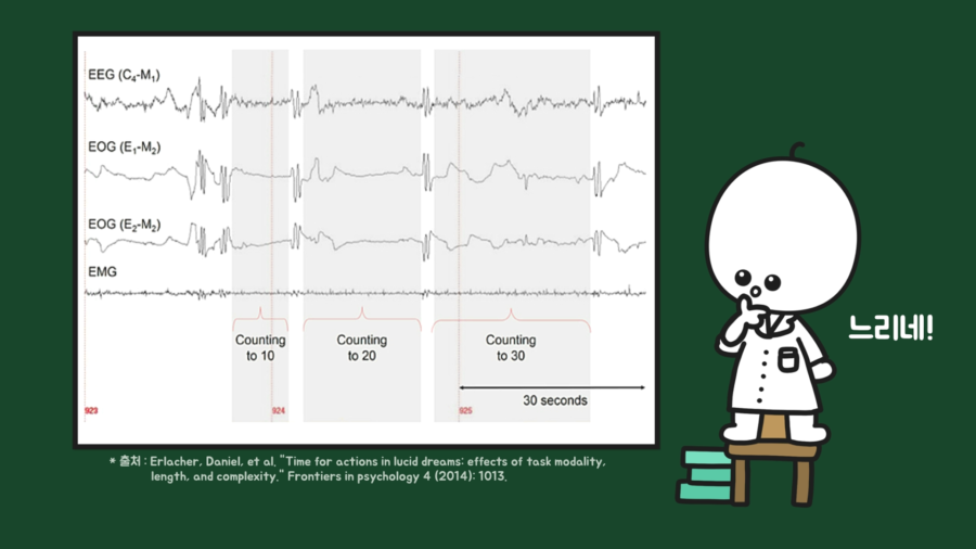 과학자들은 루시드 드리머를 통해 꿈에서의 시간 흐름을 측정하고자 했습니다. 꿈은 렘수면 단계에서 꾸고, 렘수면 때 이완되지 않는 안구 근육 신호를 활용하도록 하면 현실과 꿈에서의 시간 흐름의 차이를 알 수 있을 겁니다.