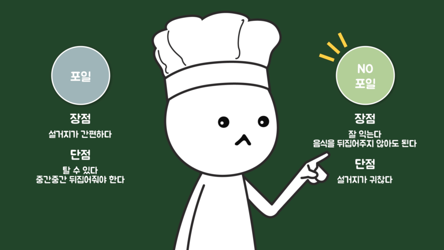이와 관련해 많은 사용자가 편리한 뒤처리를 위해 종이 포일을 바닥에 깔기도 합니다. 장단점이 있는 부분으로 종이 포일을 깔면 음식의 아랫면이 잘 안 익으므로 중간중간 뒤집어줘야 하고, 기름진 음식은 지방이 잘 빠지지 않는 단점이 있습니다.