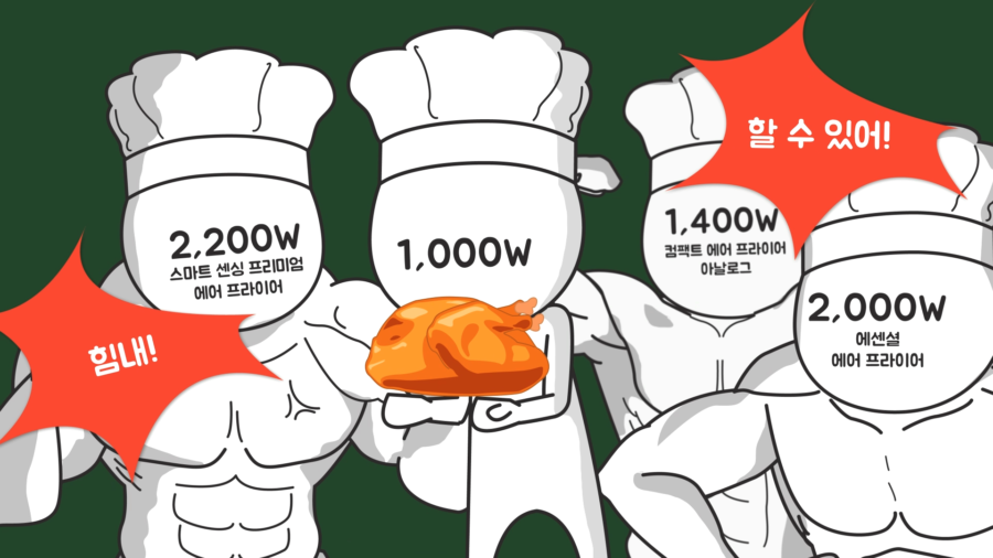 필립스의 프리미엄 모델인 ‘스마트 센싱 에어 프라이어’는 최대 출력이 2,200W로 매우 강력하고, 조금 더 보급형 모델인 ‘에센셜 에어프라이어’ 역시 2,000W의 높은 출력을 내므로 음식을 빠르게 고품질로 조리할 수 있습니다. 이 정도 출력까지는 아니더라도 최소 1,000W 이상의 제품 사용을 권장합니다.