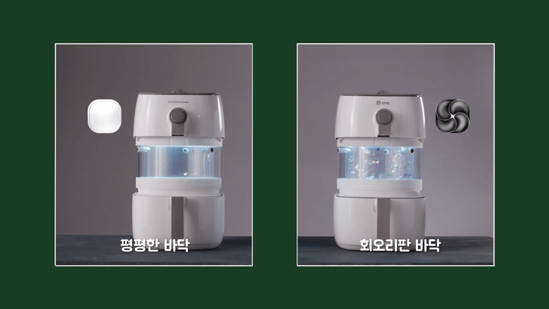 그런데 음식에서 빠져나온 기름이 바닥에 모이면 공기가 순환하면서 다시 음식으로 튈 수도 있습니다. 이 문제를 해결하기 위해 상위 모델에는 기름 튐 방지 회오리판이 추가로 있고, 기름을 1.4배 더 효과적으로 제거할 수 있습니다.