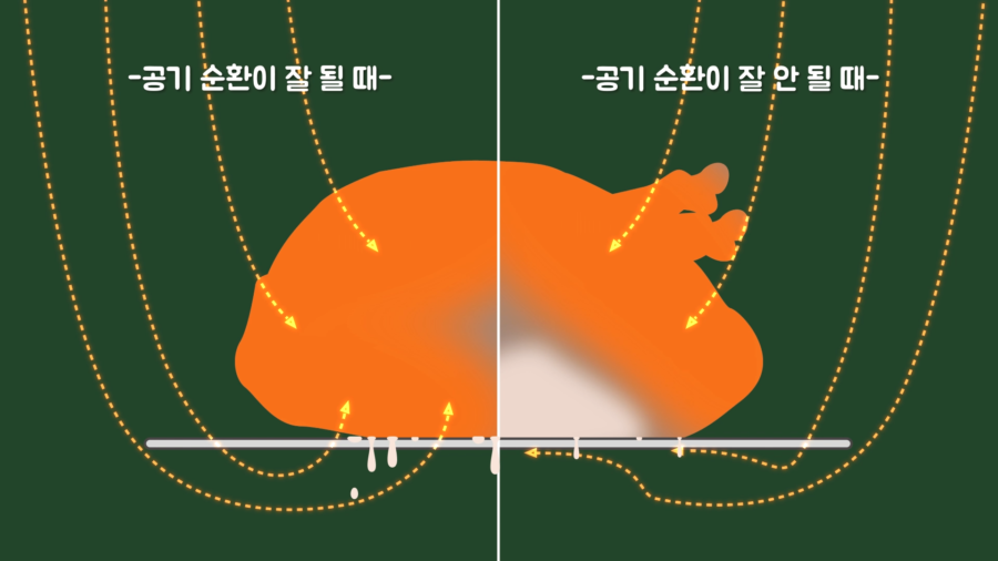 즉, 이론적으로 튀김옷의 수분을 빠르게 증발시킬 수 있으면 튀긴 것처럼 조리할 수 있다는 것이고, 여기서 고안해낸 방법이 뜨거운 공기를 활용하는 것이었습니다.