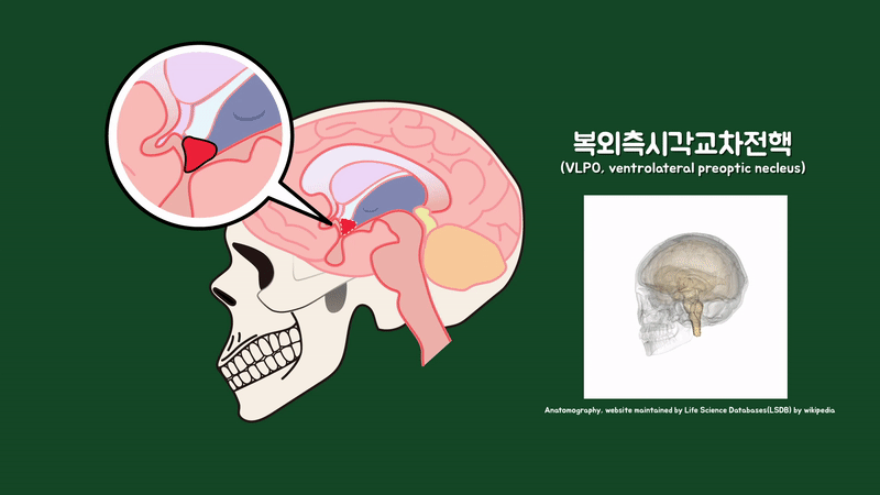 결론부터 말해보면 잠드는 순간을 기억하는 일은 불가능합니다. 먼저 잠이 어떻게 시작되는지부터 알아보면 뇌의 중심부(시상하부)에 있는 복외측시각교차전핵(VLPO, ventrolateral preoptic nucleus)이라고 하는 수면촉진신경핵이 활성화되면서 시작됩니다.
