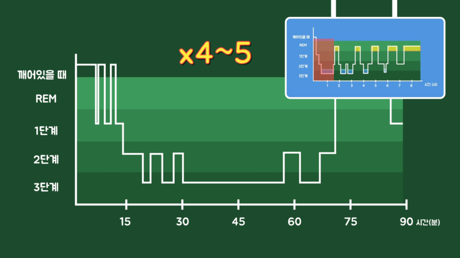 위 사이클이 한 사이클이고, 90분 정도 걸립니다. 그러므로 7~8시간 정도 잠을 자는 동안 4~5번 정도 수면 사이클을 반복한다고 보면 됩니다.