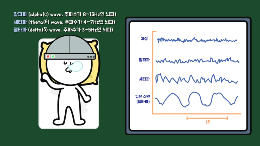 어쨌든 비렘수면 1단계가 시작되는 순간은 뇌파를 보면서 정확히 측정할 수 있습니다. 깨어있을 때는 뇌파가 빠르게 자글거리는데, 잠든 직후에는 뇌파가 평탄해지면서 느려지고, 알파파와 세타파가 증가하며 뇌의 활동이 여러 뇌 부위에 걸쳐 동기화됩니다.