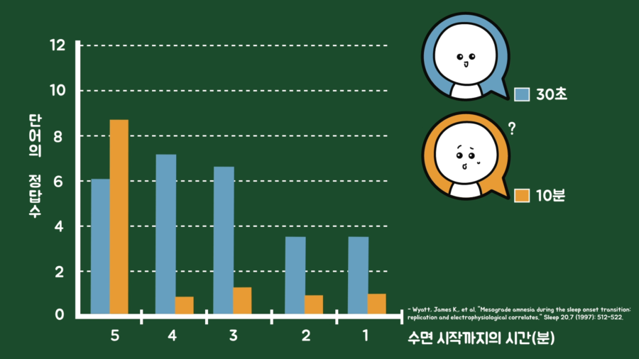 30초 동안 잠들었다가 깼을 때는 잠들기 전의 경험이 단기기억에 다소 남아있어서 떠올릴 수 있었지만, 잠이 10분 이상 지속되면 잠들기 전의 단기기억이 장기기억으로 전환되기 전에 사라져서 떠올리지 못합니다. 이런 이유로 잠들기 직전에 대한 기억은 할 수 없습니다.