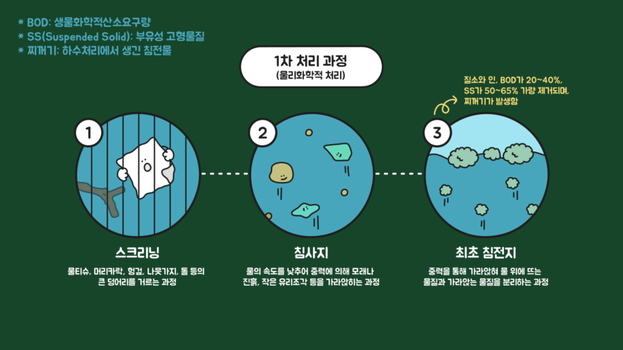참고로 대변은 하수 처리 과정 중 침전지(최초·최종) 과정에서 응집제와 중력으로 인해 가라앉은 뒤 유기물에 의해 분해됩니다. 그렇게 가라앉은 찌꺼기들은 농축조, 소화조, 개량과정, 탈수·소각의 과정을 통해 처리합니다.