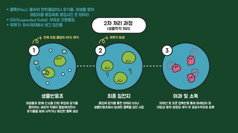 다음으로 2차 처리 과정(생물학적 처리)은 미생물과 산소, 응집제 등을 이용해 오염 물질을 제거하거나 침전시키고, 여과 및 소독하는 과정입니다.