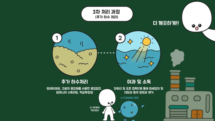 3차 처리 과정은 추가 하수 처리 과정으로 수역 보호의 목적으로 방류수의 수질을 높여 오염도를 낮추는 과정입니다. 보통 산업폐수일 때 이 과정을 추가로 거칩니다.
