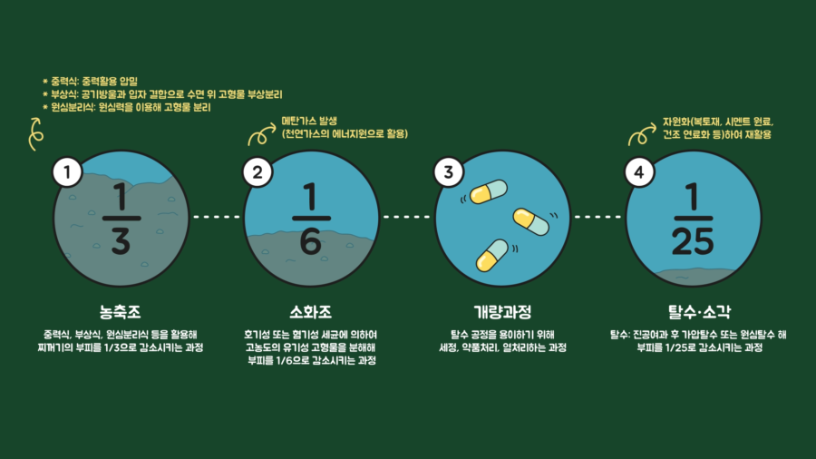 이때 처리과정 중 발생하는 메탄가스를 천연가스 대체에너지원으로 활용하기도 하고, 소각 과정에서 발생하는 에너지는 처리장 가동동력으로 활용하기도 합니다.