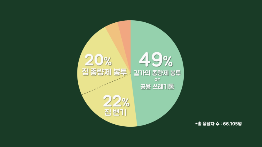 실제 강아지를 키우는 사람들이 어떻게 처리하고 있는지 궁금해서 설문조사를 해봤습니다. 결과를 보면 산책 중 길가에 보이는 종량제 봉투 또는 공용 쓰레기통에 처리한다는 응답이 절반 가까이 됐습니다.