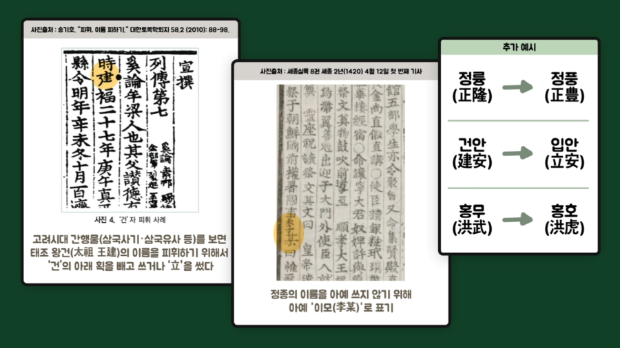 이와 같은 풍속을 기휘(忌諱) 또는 피휘(避諱)라고 하는데, 휘(諱)로 통칭해 설명을 이어가보면 임금의 이름은 입에 올리는 것 외에도 쓰는 것조차 삼갔습니다. 문제는 존재하는 글자를 못 쓰게하면 여러모로 불편한 점이 생길 수 있다는 것이고, 평소 자주 사용하는 글자라면 더욱 그럴 겁니다.