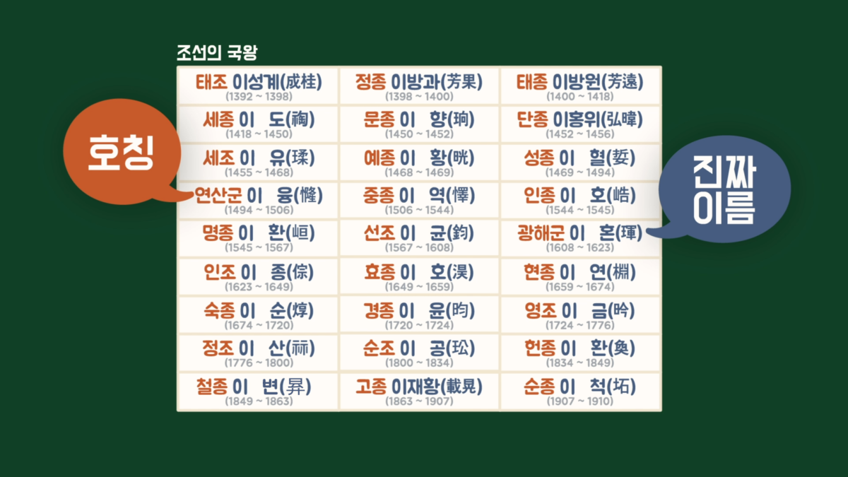조선왕조의 계보를 본 적이 있을 겁니다. 맨 앞글자만 따서 노래 부르듯이 암기하기도 하는데, 이건 임금의 이름이 아니라 묘호(廟號)라고 합니다.