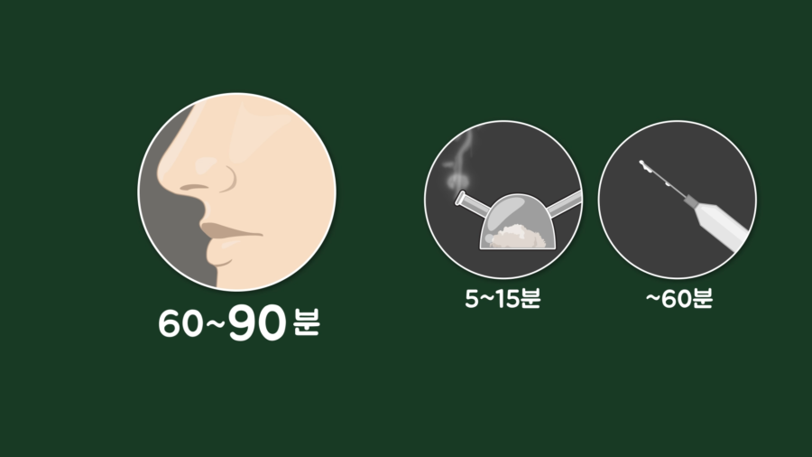 이때 코로 흡입하면 효과가 최장 60~90분까지 지속되는데, 다른 방식로 흡입하면 효과의 지속 시간이 짧기에 코로 흡입하는 방식을 많이 따릅니다.