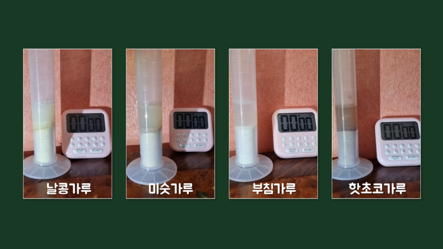 미숫가루를 손으로 만져보면 입자가 상당히 고와서 물에 잘 녹을 것으로 생각하기 쉽습니다. 이와 관련해 미숫가루 및 여러 종류의 가루를 가지고 물이 얼마나 스며드는지 실험을 해봤습니다. 3분 정도의 시간이 흐른 뒤 물이 스며든 정도를 확인해봤을 때 가루 모두에서 잘 스며들지 않은 것을 확인할 수 있었습니다.