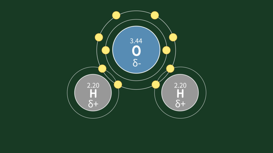 물을 구성하는 2개의 수소 원자와 1개의 산소 원자 결합에서 산소가 수소보다 전기음성도가 크므로 산소가 전자를 더 강하게 끌어당깁니다. 이에 따라 한쪽 원자에 기울어져 있는 비대칭 구조가 만들어지고, 산소 원자는 부분적으로 음전하(-)를, 수소 원자는 부분적으로 양전하(+)를 띠게 됩니다.