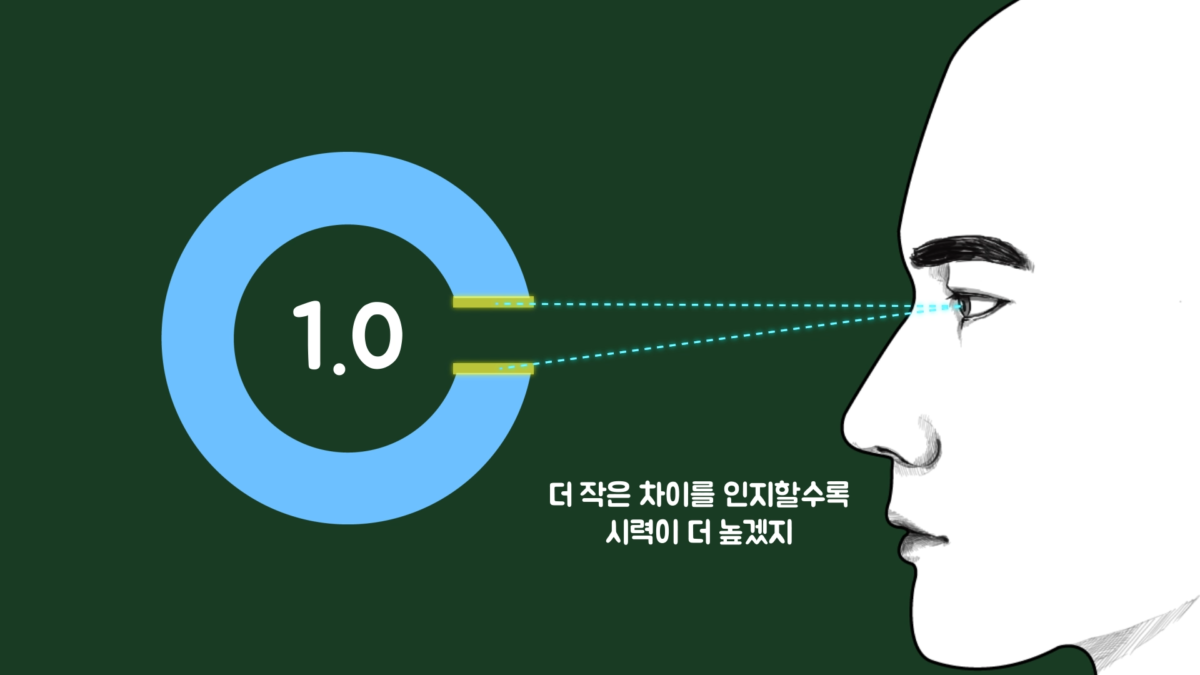 예를 들면 이러한 계산법을 사용하여 측정되는 시력표 중의 하나인 란돌트링(Landolt ring)이라는 것이 있는데, 직경이 7.5mm, 폭이 1.5mm, 끊어진 폭이 1.5mm인 란돌트 링의 끊어진 방향을 5m 떨어진 거리에서 인지할 수 있는 시력을 1.0으로 정했습니다.